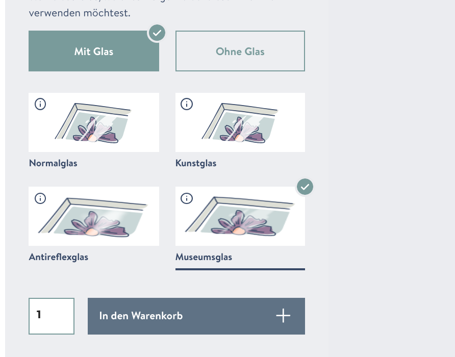 Passepartout hinzufügen, Glasart & Druck-Qualität wählen